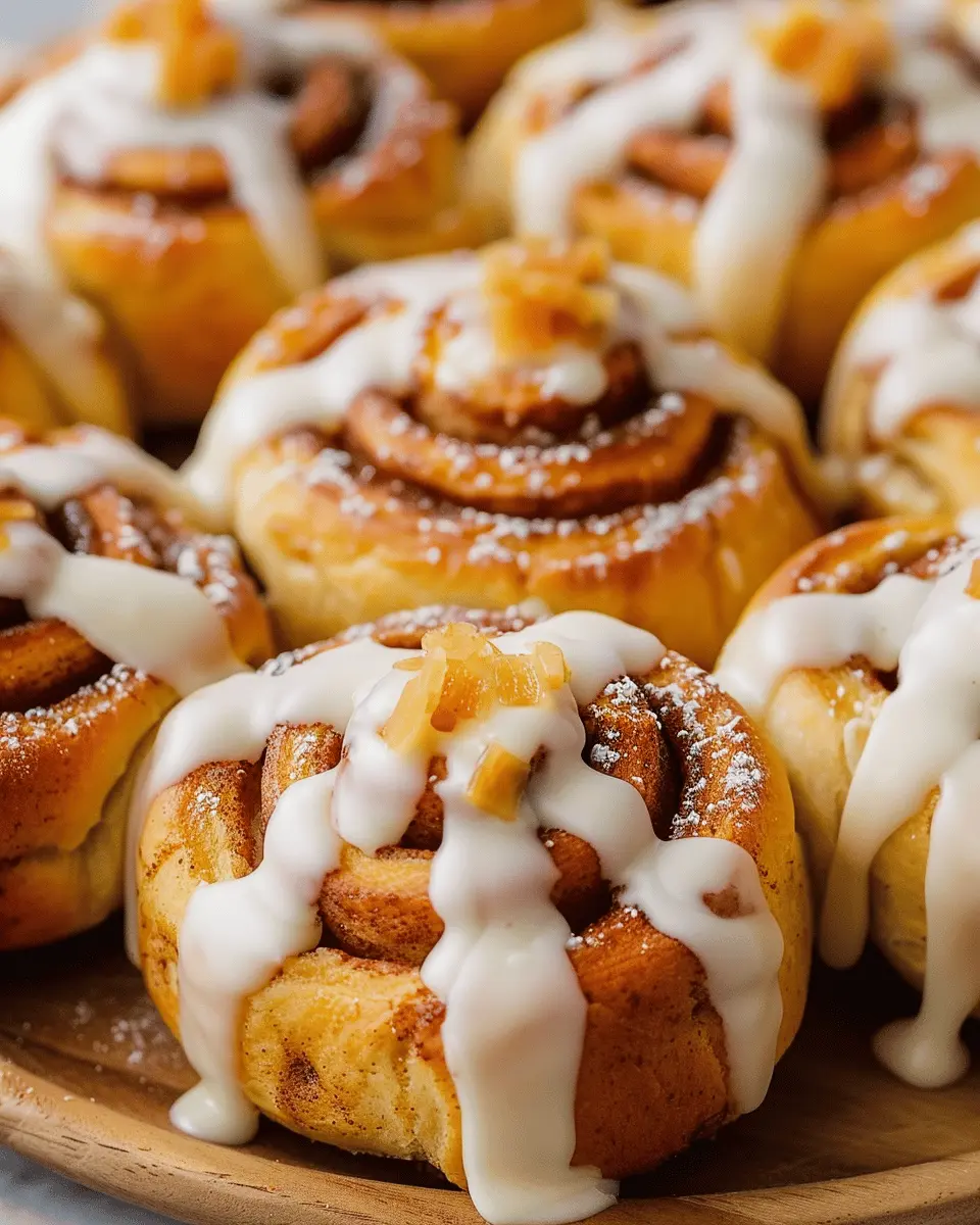 Indulge in the delightful flavors of autumn with these charming pumpkin-shaped cinnamon rolls topped with creamy frosting.
