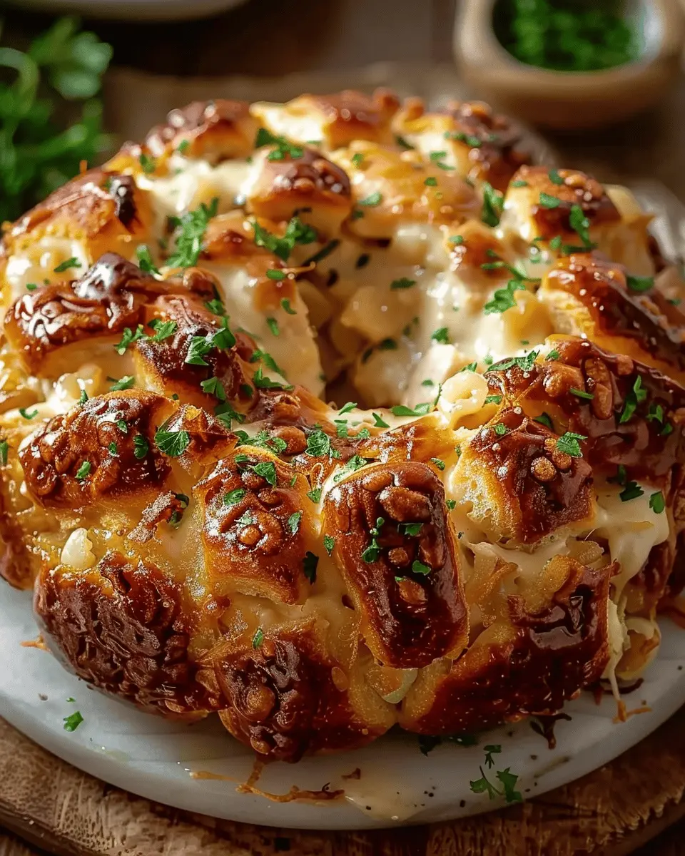 Garnish with fresh parsley for a vibrant touch. Serve warm and watch as your friends dig in! This chicken Alfredo treat is not your average bread; it’s a communal dish perfect for sharing — everyone will have a bit of fun pulling apart the delicious layers.