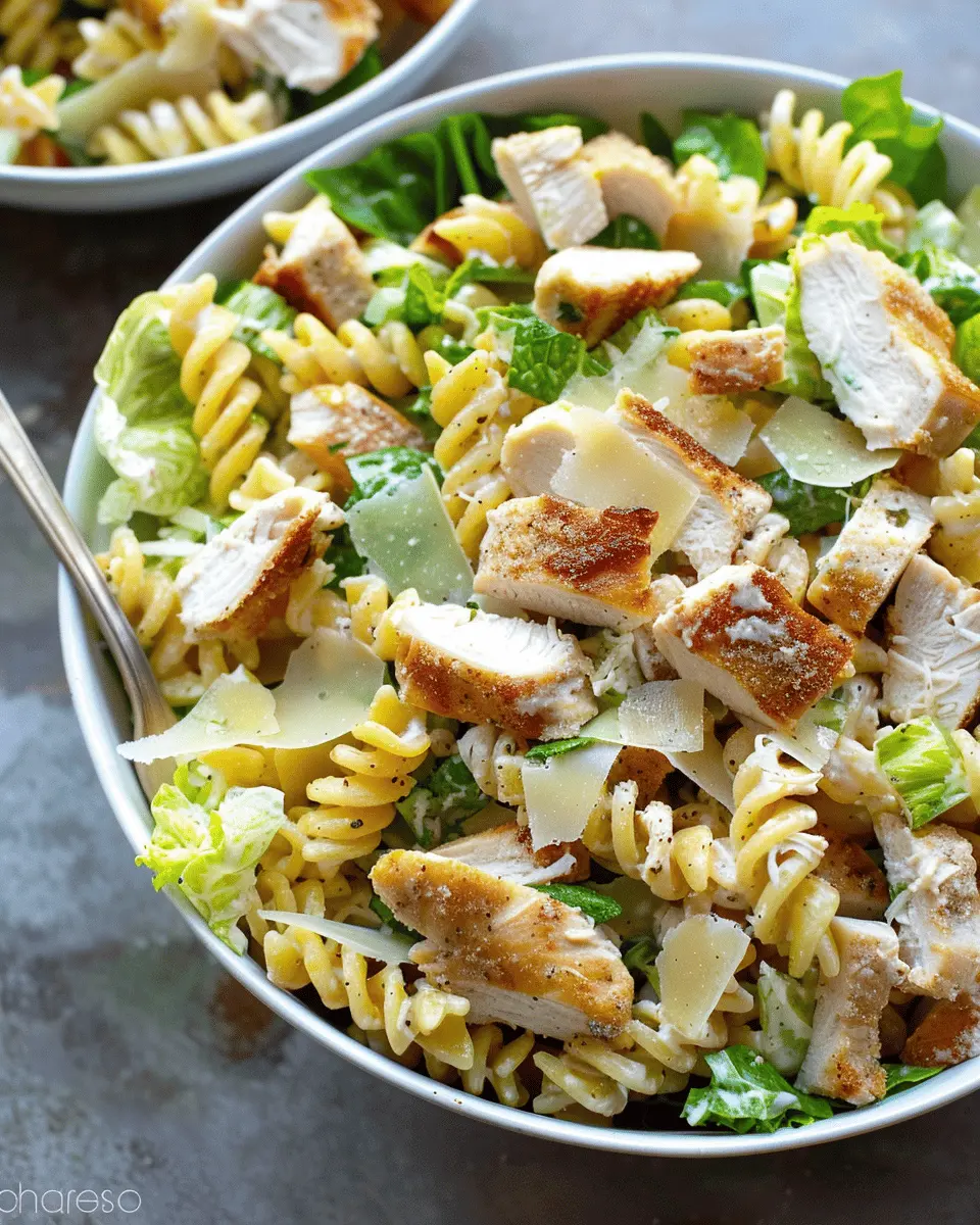 And there you have it! A sumptuous chicken Caesar pasta salad that not only satisfies your taste buds but is also easy to whip up in a hurry. Enjoy soft, savory bites of chicken alongside crisp veggies, all enveloped in a creamy dressing. It’s a dish that feels indulgent yet fresh, perfect for any occasion.