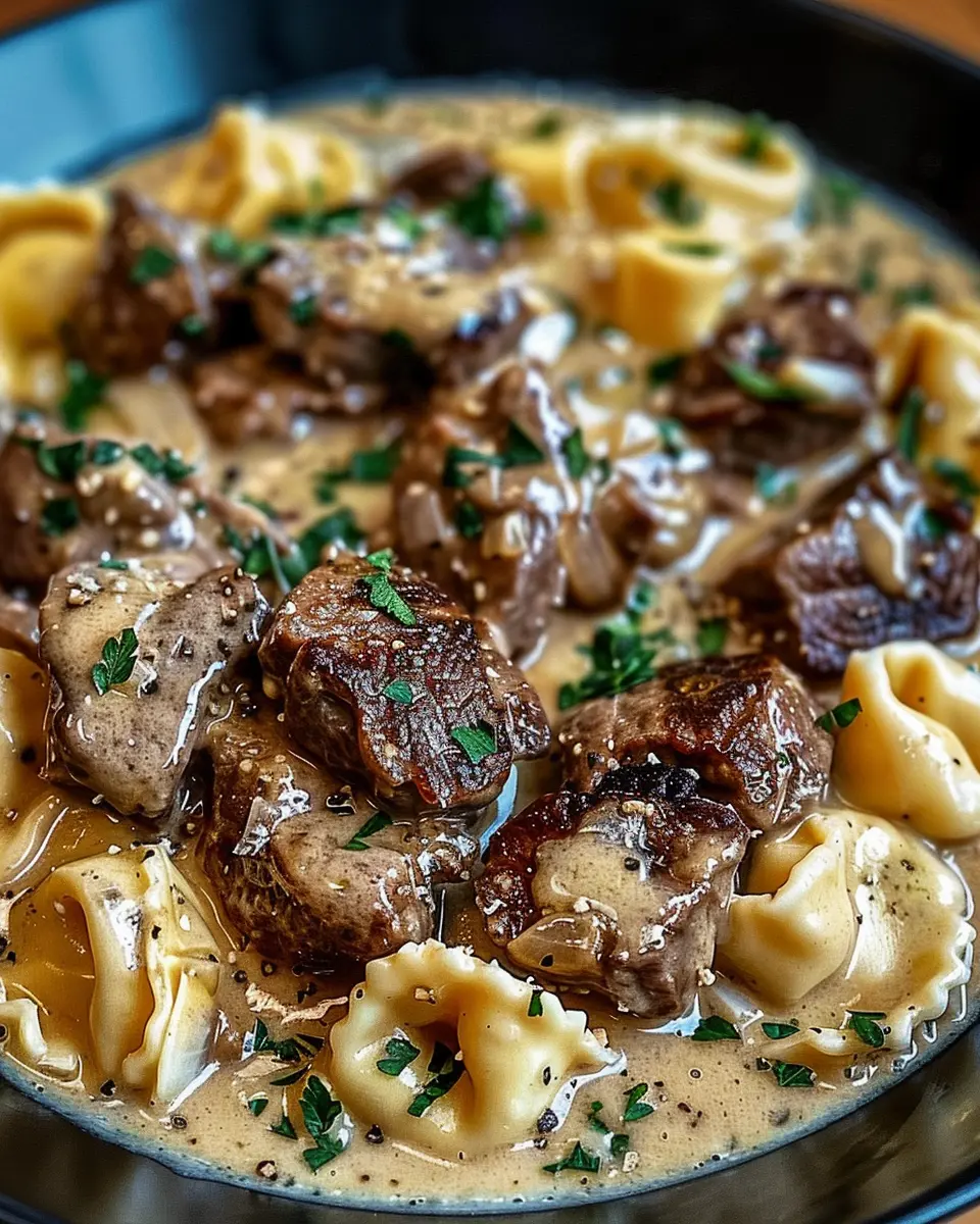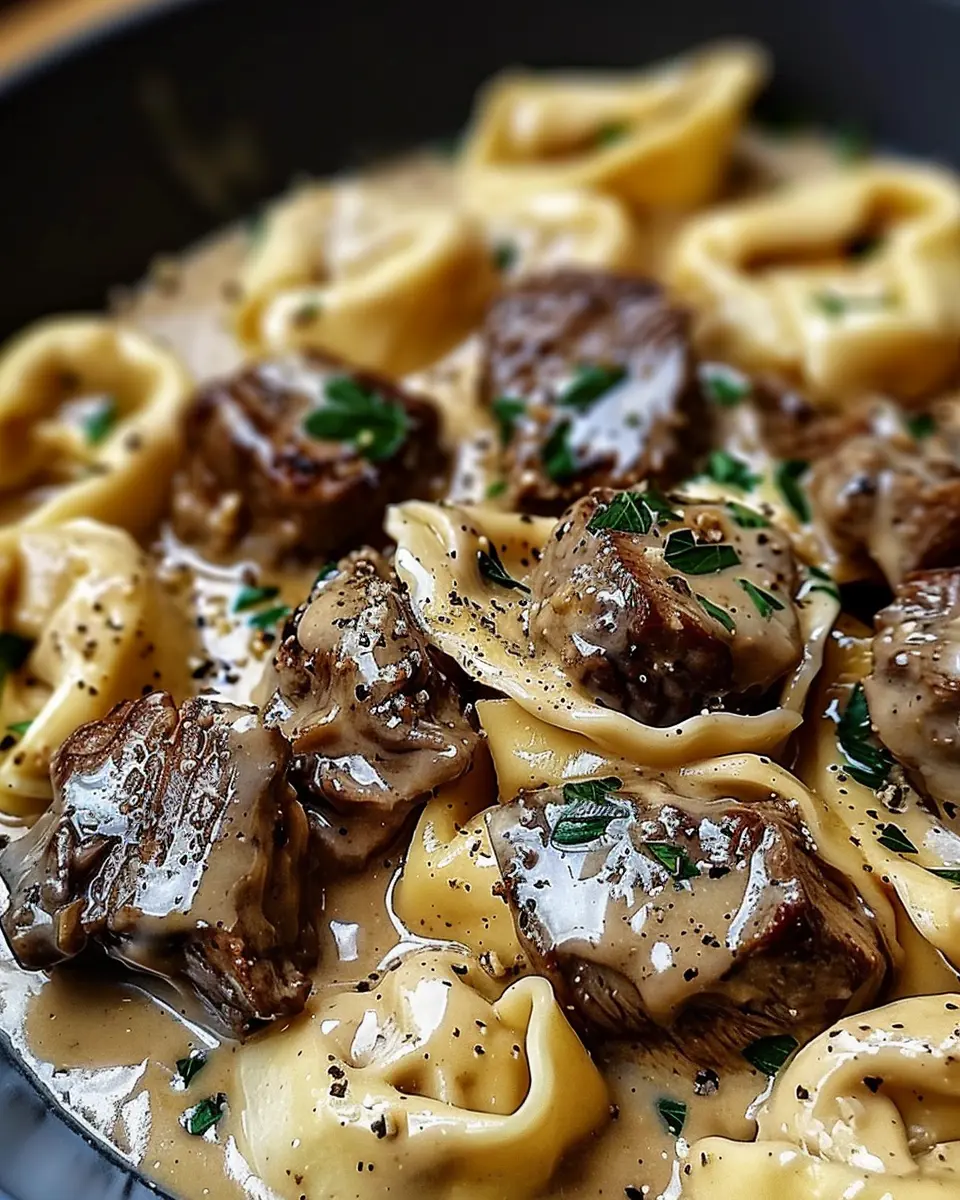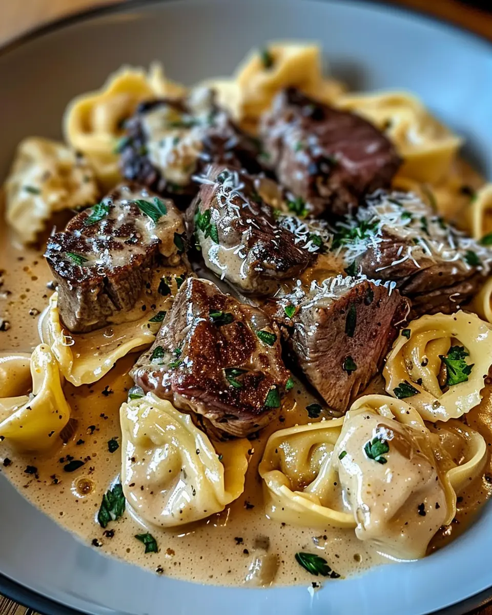 Experience the rich flavors of cracked garlic and tender steak combined with creamy tortellini in this indulgent comfort dish.