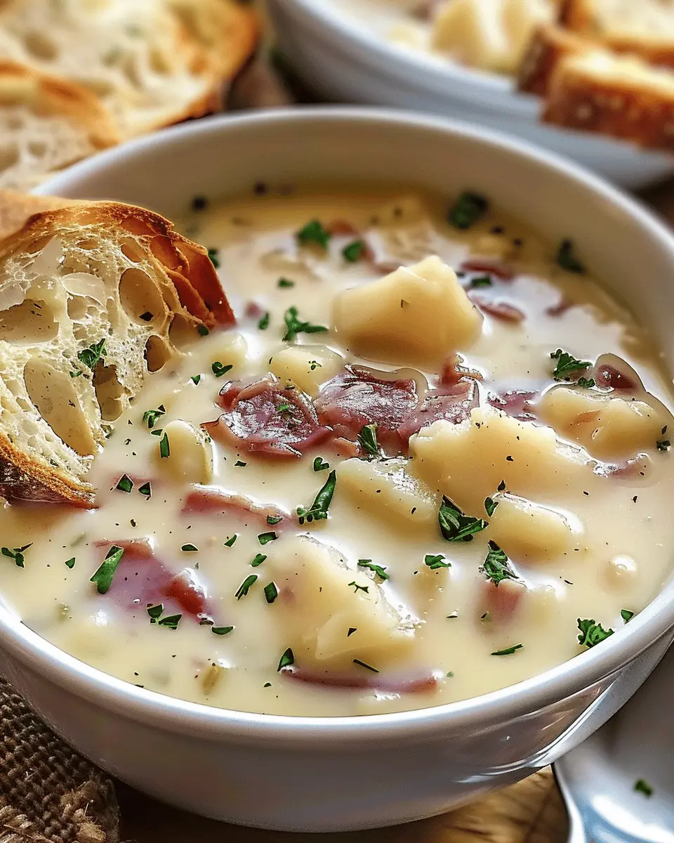 A rich and flavorful twist on the classic Reuben sandwich, this creamy soup combines turkey bacon and chicken ham for a delightful meal.