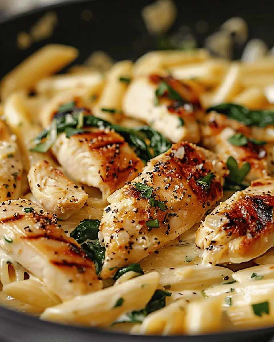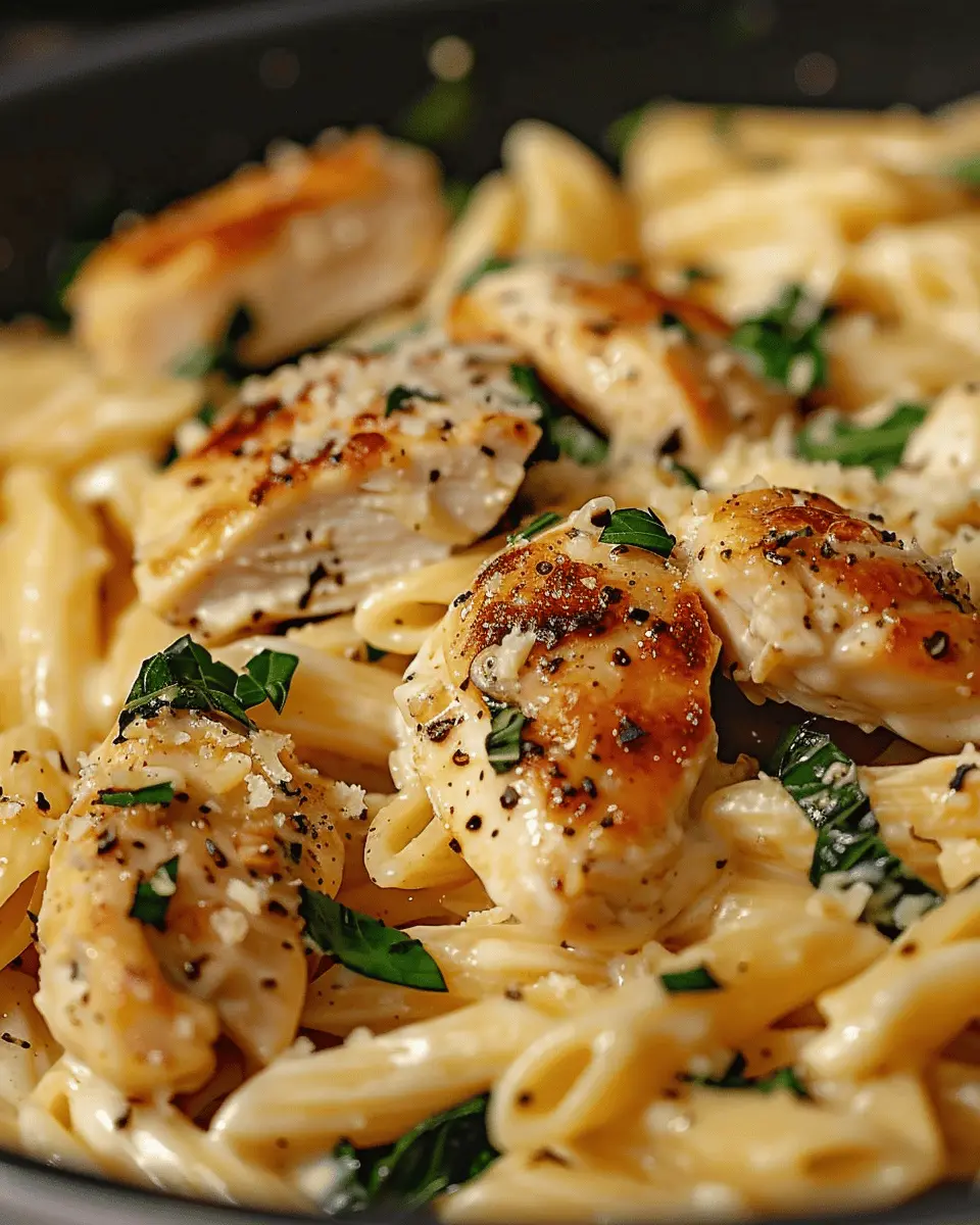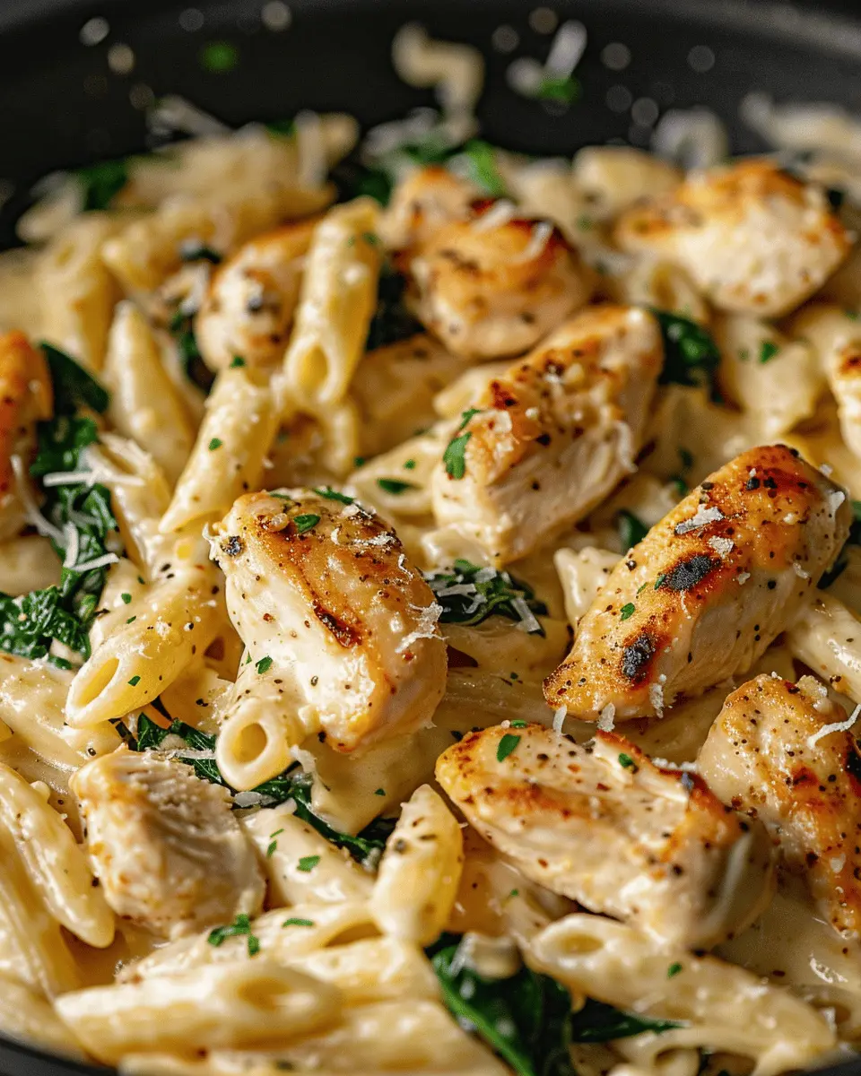 Once you’ve prepped everything, the fun really begins. Cooking takes around 20 minutes, which makes this dish feasible even on a busy weeknight. You’ll sauté the chicken until it’s golden and tender and then bring the pasta into the mix for a quick toss with your garlic and parmesan.
