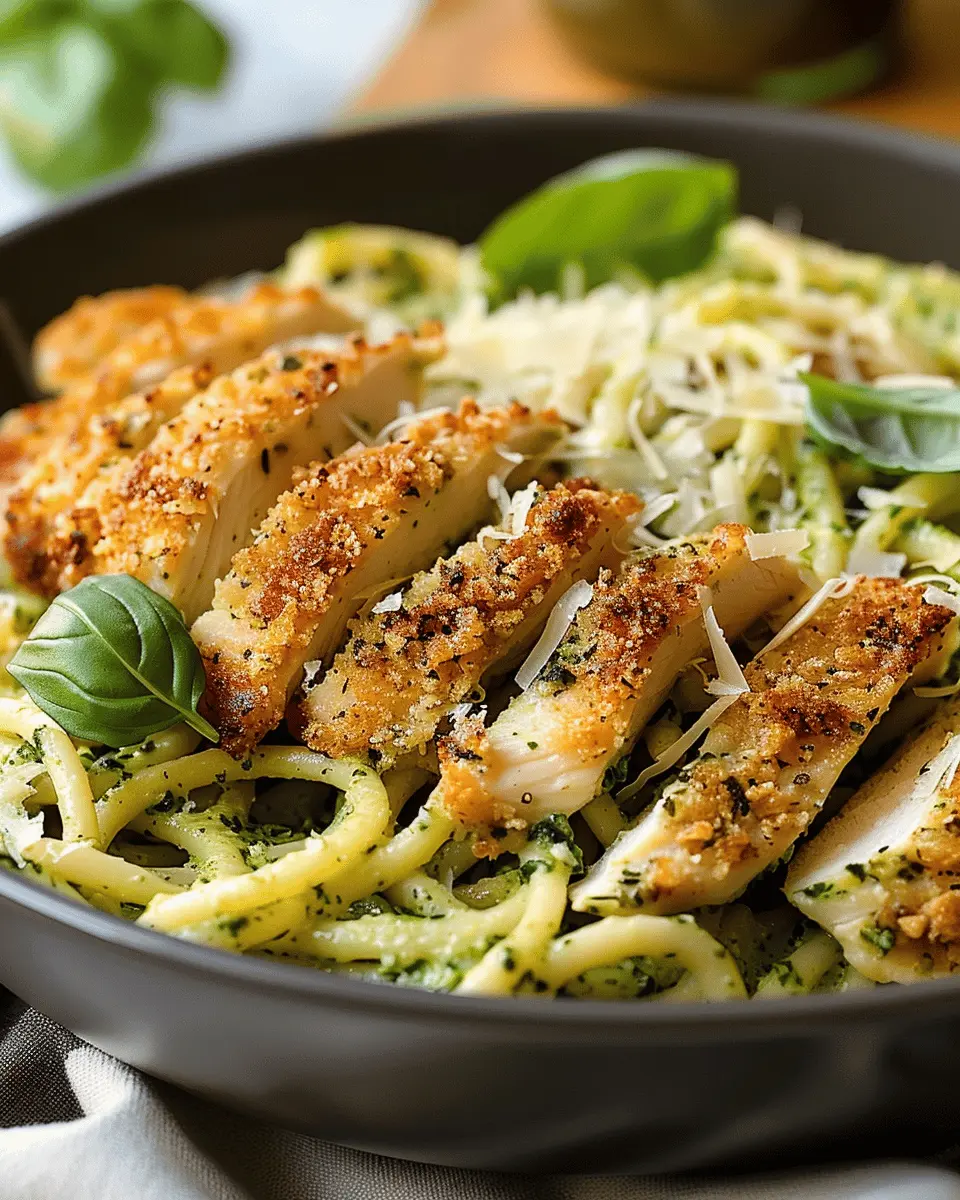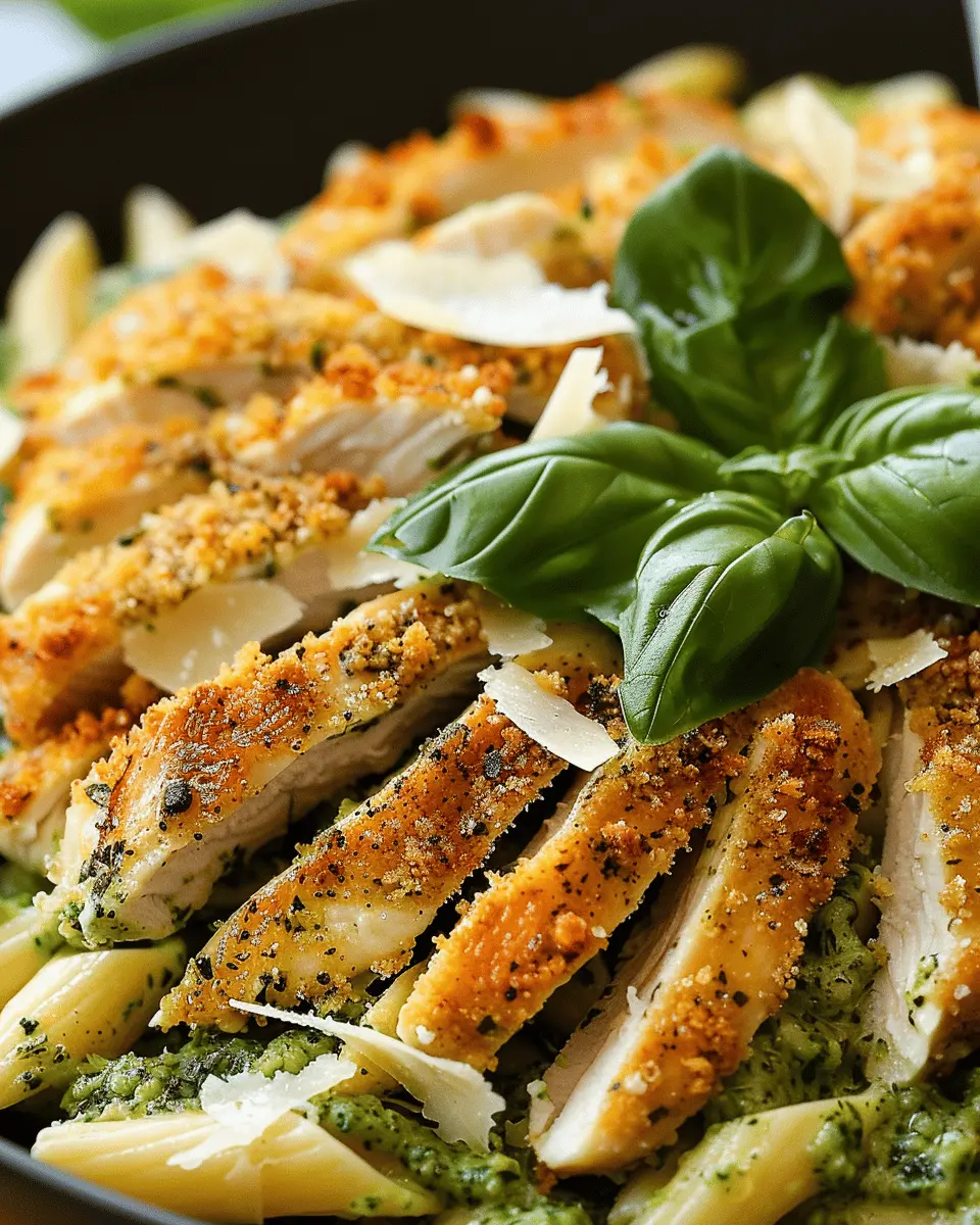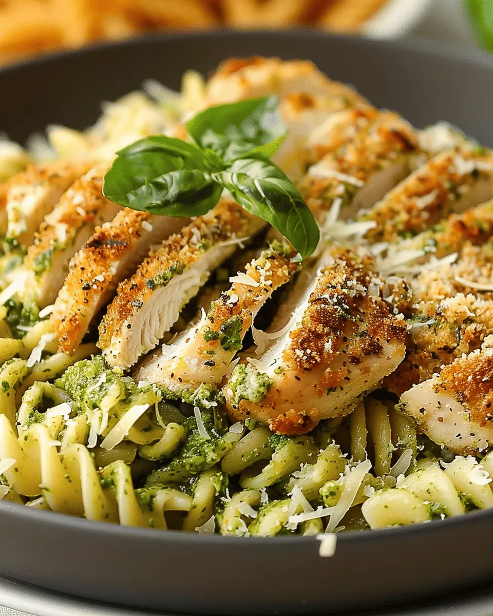 A delightful and easy-to-make pesto pasta dish topped with crispy parmesan chicken.