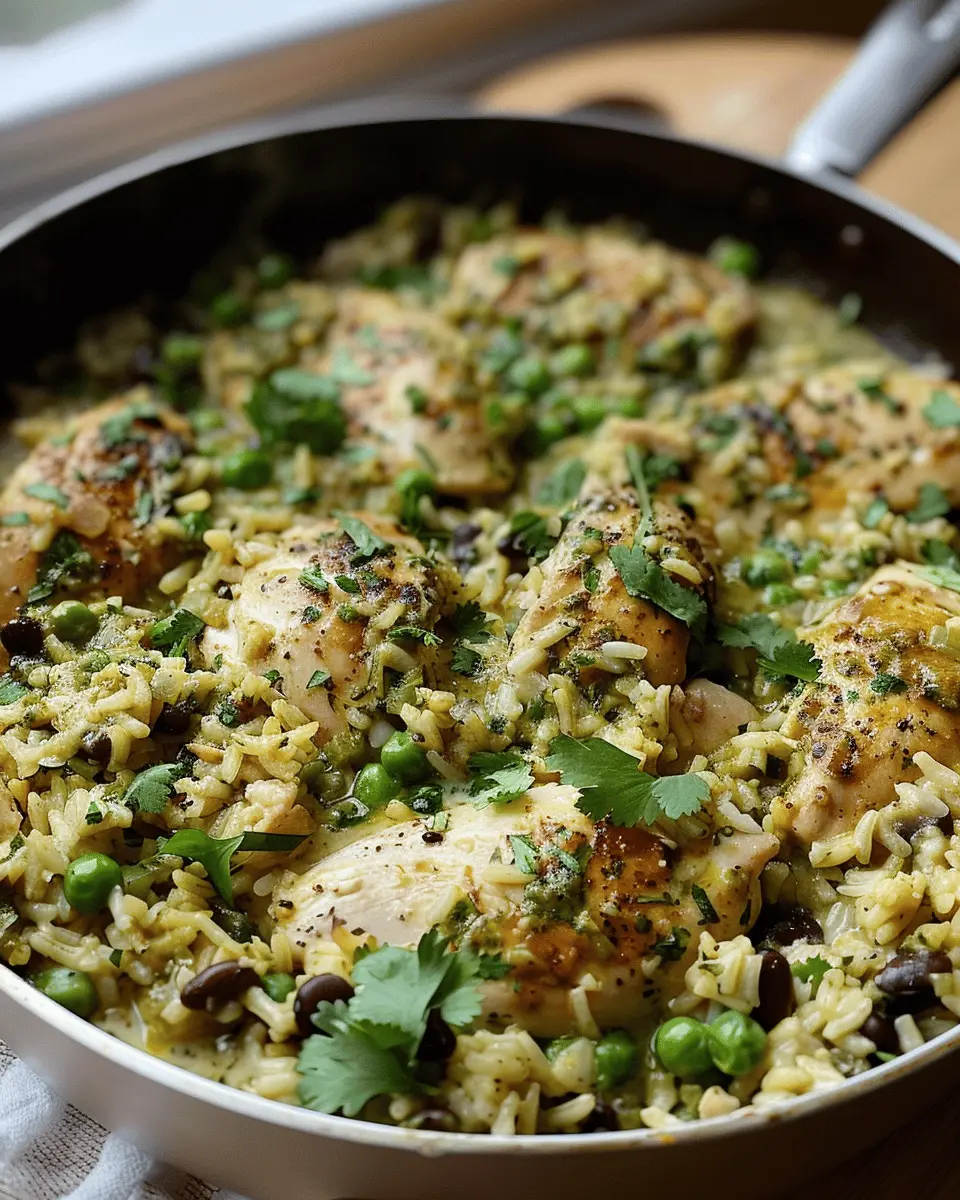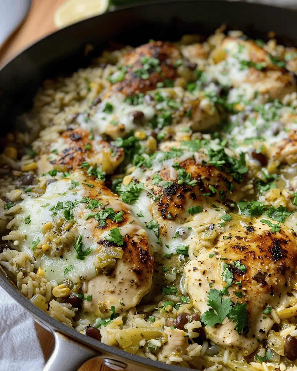 A quick and delicious one-skillet meal that combines tender chicken with rice and zesty salsa verde, perfect for busy weeknights.