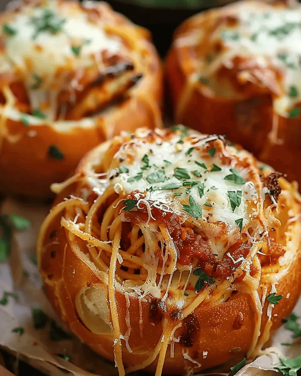 Preheat your oven to 375°F (190°C). Carefully fill each hollowed bread bowl with the spaghetti mixture, pressing down slightly so they fit snugly. Place the filled bowls on a baking sheet and bake for about 10-12 minutes or until the bread is golden and crispy on the edges.